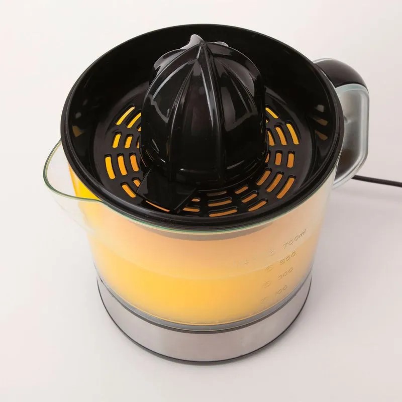 Su tapa transparente te permite ver el proceso, y el depósito con asa hace que verter el jugo sea cómodo y sin salpicaduras.
