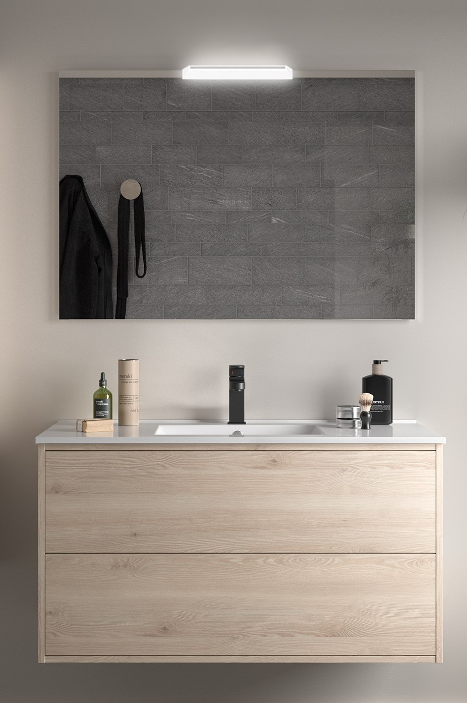Los muebles de ba帽o ATTILA destacan por su聽caracter铆stico tirador negro.