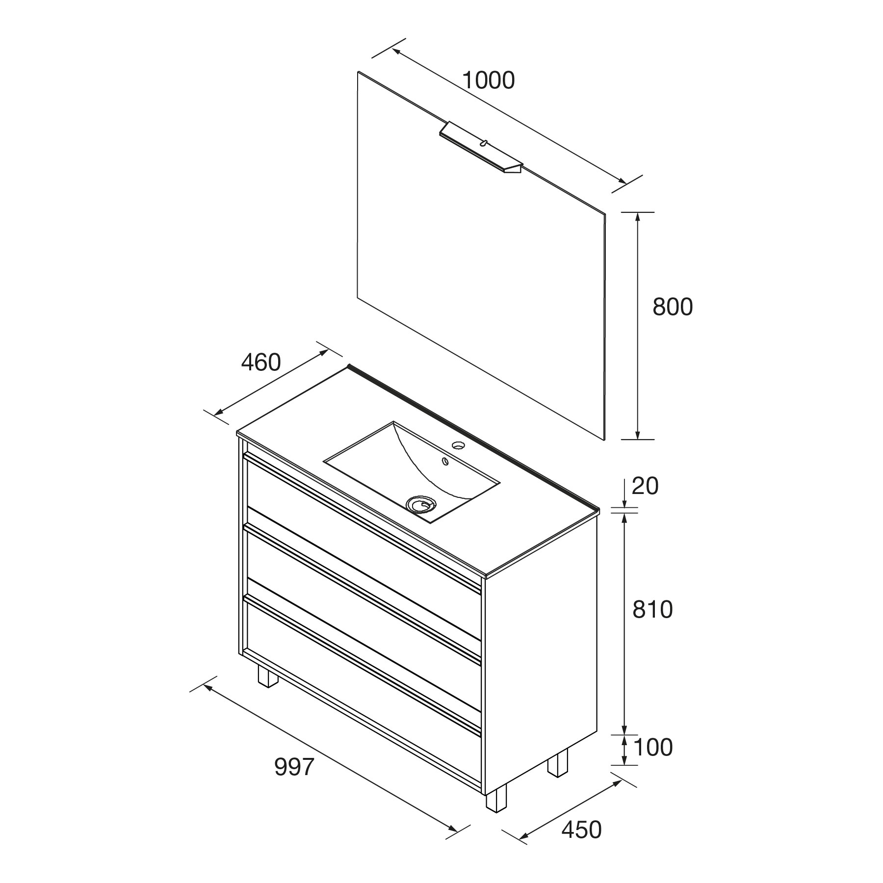 Incluye bajo 3 cajones, lavabo porcelana, espejo, aplique y un juego de 4 patas negras de 10 cm.
