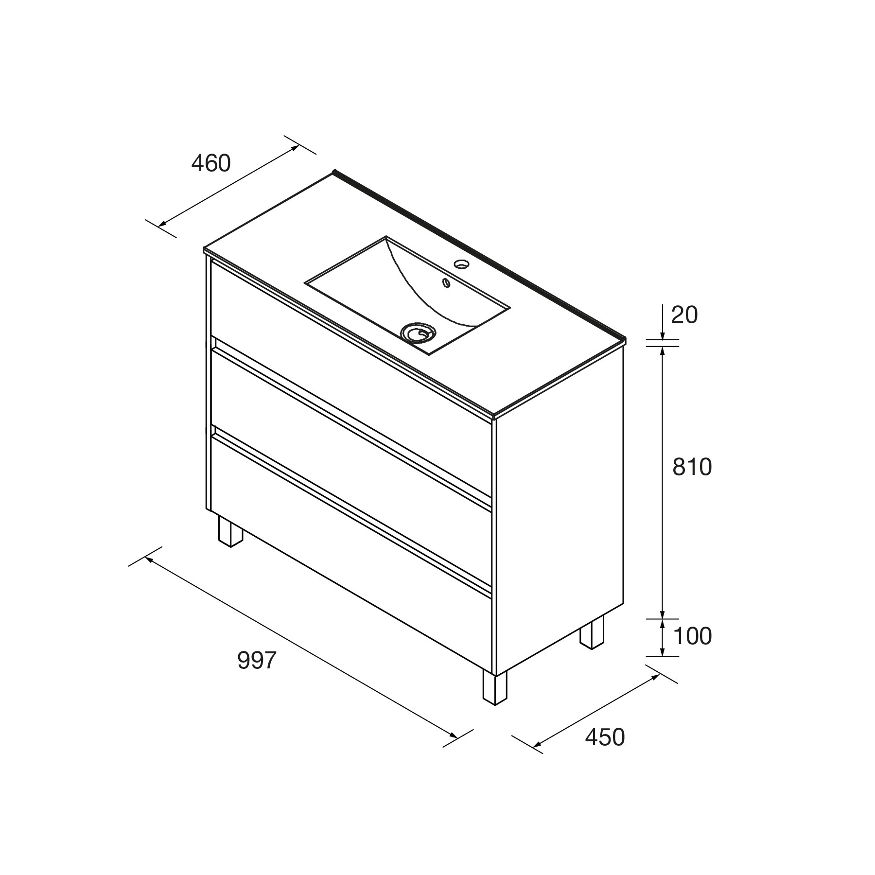 - Tres cajones a suelo, con patas, de 100 cm.